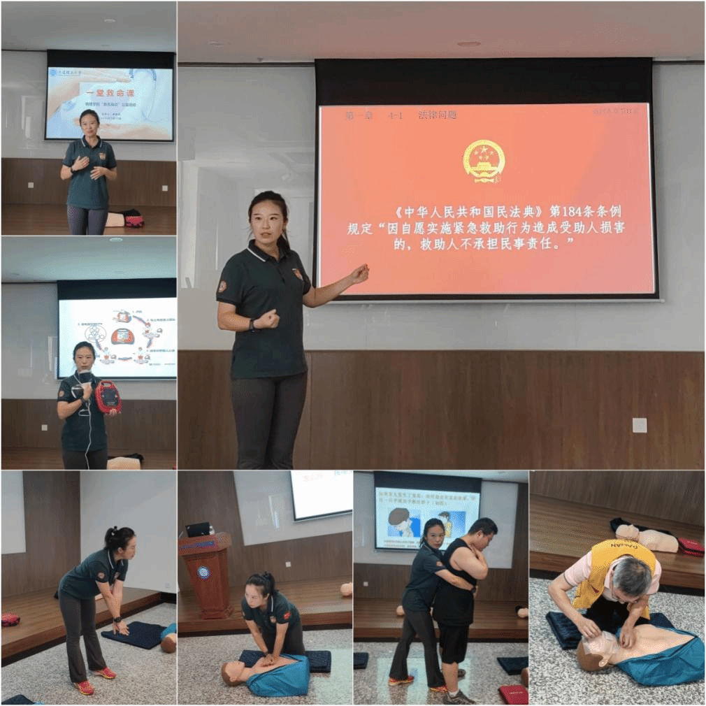 首先,由曲老师为现场人员带来一场题目为《一堂救命课》的讲座,曲老师采用理论讲解和现场模拟操作相结合的方式,凭借丰富的教学和实践经验,着重讲解了心肺复苏、自动体外除颤器的使用、心脑血管疾病及自然灾害的防护与逃生等方面的知识。曲老师的讲解通俗易懂,参加讲座的人员积极与老师互动,现场学习氛围浓厚。与曲老师一同来到讲座的其他工作人员在曲老师的指引下为现场人员进行实操展示。